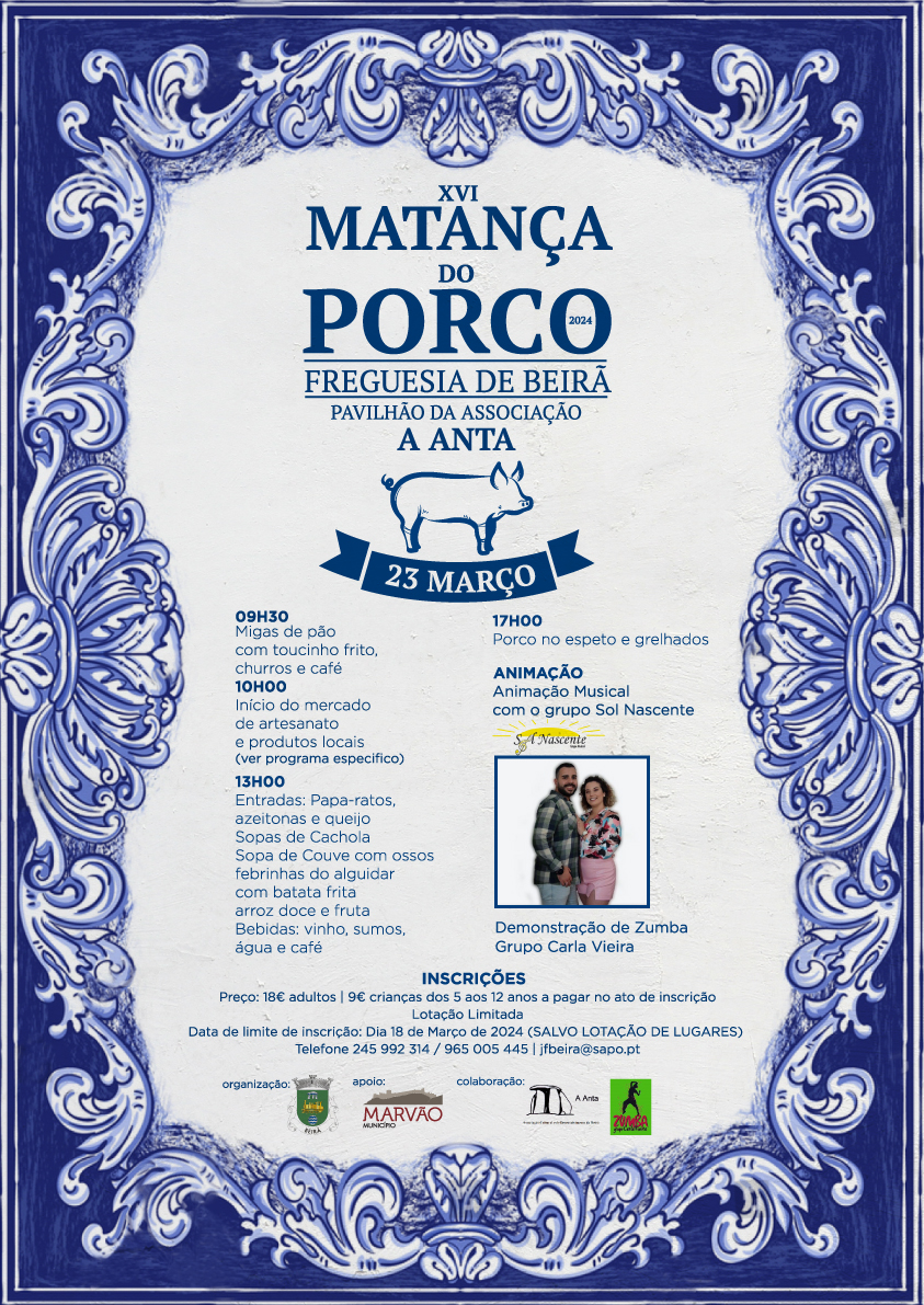 A Junta de Freguesia de Beirã irá realizar no dia 23 de Março (sábado), mais um evento referente à matança do porco, destinada a todas as pessoas interessadas a participar neste evento, bem como dinamizar e preservar os hábitos e características existentes nesta zona.